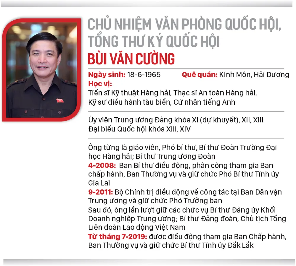 Đồng chí Bùi Văn Cường, Ủy viên Trung ương Đảng, Ủy viên UBTVQH, được bầu giữ chức Chủ nhiệm Văn phòng Quốc hội, Tổng Thư ký Quốc hội.