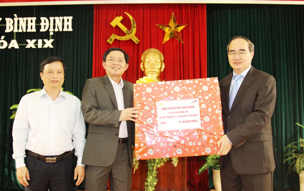 Đồng chí Nguyễn Thiện Nhân đã trao quà, chúc Tết đến các lãnh đạo tỉnh Bình Định. Đồng chí mong muốn, Bình Định sẽ vượt qua những khó khăn trước mắt, để vươn lên phát triển bền vững.
