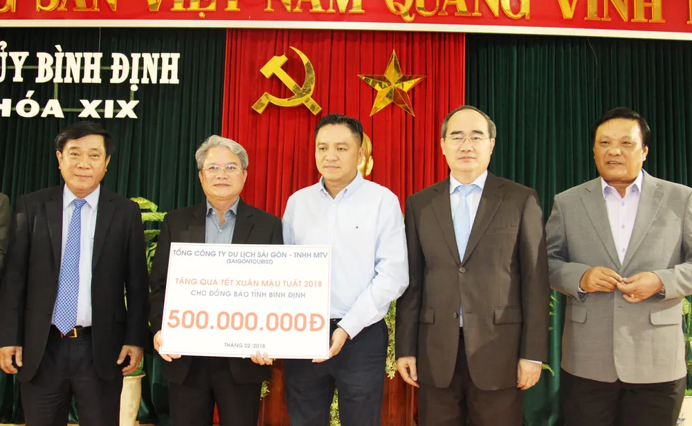Qua đó, đoàn công tác đã trao bảng tượng trưng quà Tết Mậu Tuất 2018 với số tiền 500 triệu đồng cho tỉnh Bình Định, đây là món quà do Tổng công ty Du lịch Sài Gòn thay mặt đoàn công tác tặng cho tỉnh Bình Định chăm lo Tết Mậu Tuất 2018 cho người dân.