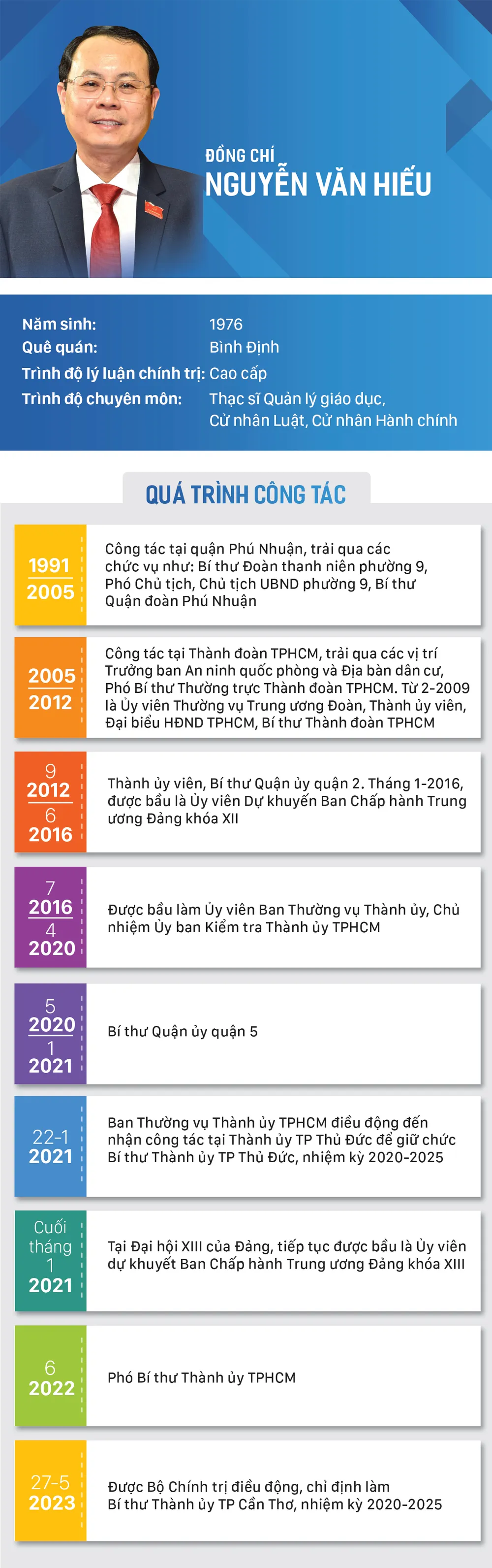 Theo đó, đồng chí Nguyễn Văn Hiếu sẽ thôi tham gia Ban chấp hành, Ban Thường vụ và thôi giữ chức vụ Phó Bí thư Thành ủy TPHCM nhiệm kỳ 2020-2025 để điều động, phân công, chỉ định tham gia Ban Chấp hành, Ban Thường vụ và giữ chức Bí thư Thành ủy Cần Thơ, nhiệm kỳ 2020-2025.