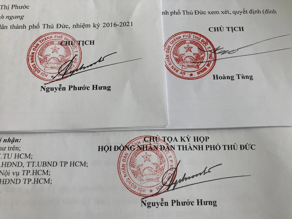 Con dấu, chữ ký của lãnh đạo HĐND và UBND TP Thủ Đức. Ảnh: KIỀU PHONG