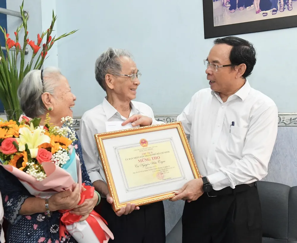 Bí thư Thành ủy TPHCM Nguyễn Văn Nên thăm, chúc mừng thọ 90 tuổi cụ Nguyễn Hữu Trym. Ảnh: VIỆT DŨNG |