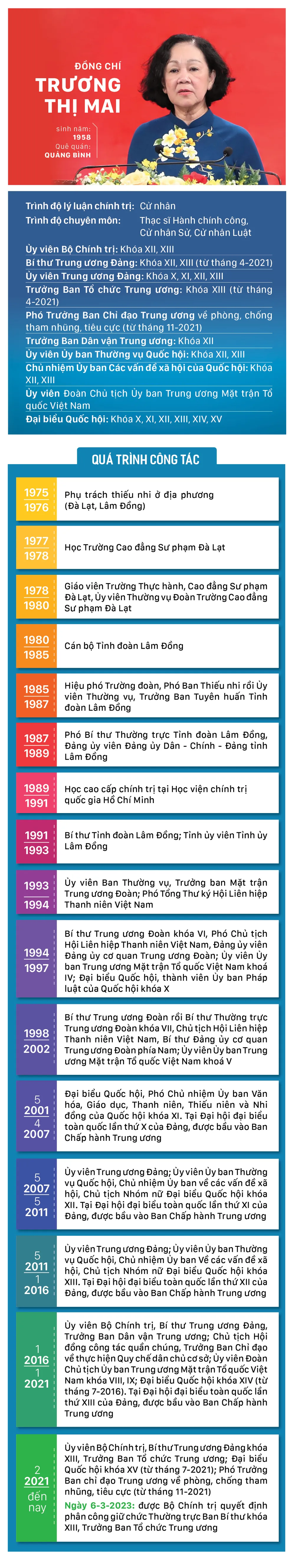 Chiều 6-3 tại trụ sở Trung ương Đảng, Bộ Chính trị đã họp để xem xét về công tác cán bộ. Tại cuộc họp, Bộ Chính trị quyết định đồng ý đồng chí Võ Văn Thưởng, Ủy viên Bộ Chính trị, Chủ tịch nước, Thường trực Ban Bí thư khóa XIII thôi giữ chức Thường trực Ban Bí thư. Bộ Chính trị quyết định phân công đồng chí Trương Thị Mai, Ủy viên Bộ Chính trị, Bí thư Trung ương Đảng, Trưởng Ban Tổ chức Trung ương giữ chức Thường trực Ban Bí thư khóa XIII, Trưởng Ban Tổ chức Trung ương.