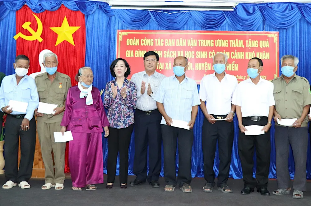 Đồng chí Trương Thị Mai tặng quà cho các hộ gia đình chính sách tại xã Đất Mũi