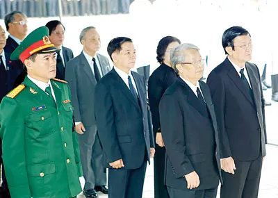 Chủ tịch Quốc hội Nguyễn Sinh Hùng: “Chúng tôi xin kính cẩn nghiêng mình, kính viếng và tiễn Đại tướng tới nơi an nghỉ vĩnh hằng. Xin chia sẻ với đau thương vô hạn của phu nhân và toàn gia quyến. Kính viếng!”.