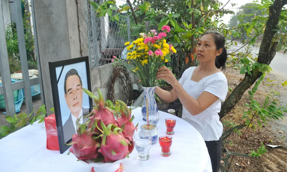 Người dân xã Tân Thông Hội cắm hoa bàn thờ nguyên Thủ tướng Phan Văn Khải tại bàn thờ đặt trước nhà mình. Ảnh: CAO THĂNG