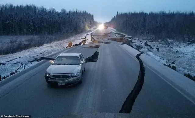 Một chiếc xe bị mắc kẹt trên con đường bị sập gần sân bay sau trận động đất ở thành phố Anchorage, bang Alaska, Mỹ