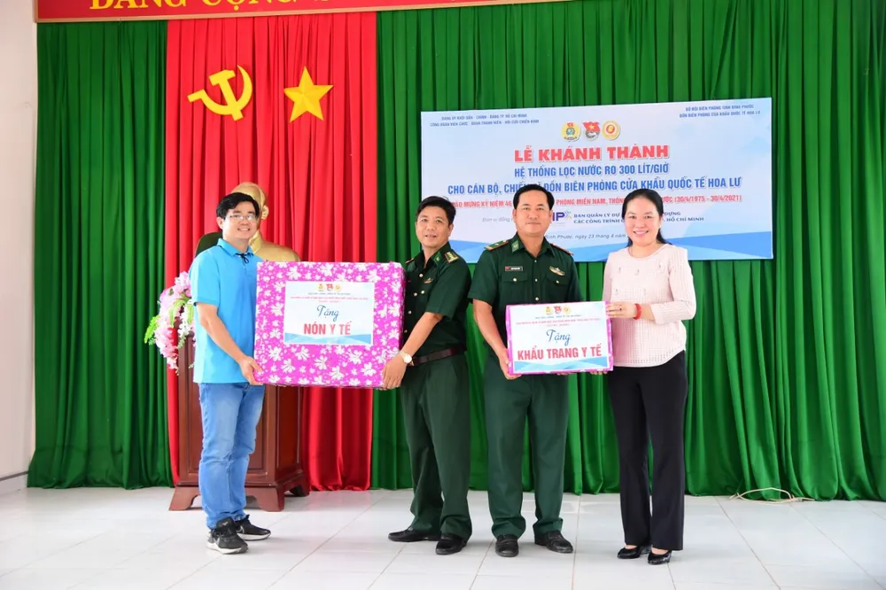 Ngoài ra, 3 đoàn thể cũng phối hợp với Ban quản lý Dự án đầu tư xây dựng các công trình giao thông TPHCM bàn giao 2 hệ thống lọc nước RO công suất 300 lít/giờ cho Đồn Biên phòng cửa khẩu Quốc tế Hoa Lư và Trạm Kiểm soát cửa khẩu Hoa Lư (huyện Lộc Ninh, tỉnh Bình Phước). Bên cạnh đó, đoàn cũng trao tặng khẩu trang y tế, nón y tế cho các chiến sĩ tại Đồn Biên phòng Đắc Ơ, Đồn Biên phòng cửa khẩu Quốc tế Hoa Lư và Trạm Kiểm soát cửa khẩu Hoa Lư.