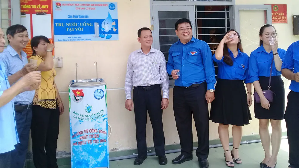 Với chủ đề “Hãy thay đổi thói quen sử dụng nước giếng để đảm bảo sức khỏe của bạn và gia đình”, Công ty cổ phần Cấp nước Thủ Đức phối hợp Đoàn Thanh niên quận Thủ Đức trao tặng 2 hệ thống lọc nước uống tại vòi cho công nhân, người lao động tại Khu lưu trú Thanh niên công nhân (phường Linh Xuân) và Sân chơi Thanh thiếu nhi đình Trường Thọ (phường Trường Thọ). Việc trao tặng trụ nước uống tại vòi nhằm hỗ trợ người lao động và các em thiếu nhi có điều kiện được uống nước sạch, đảm bảo an toàn sức khỏe (ảnh).