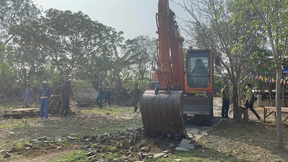 | Lực lượng chức năng tiến hành tháo dỡ các công trình xây dựng ven hồ Trị An |