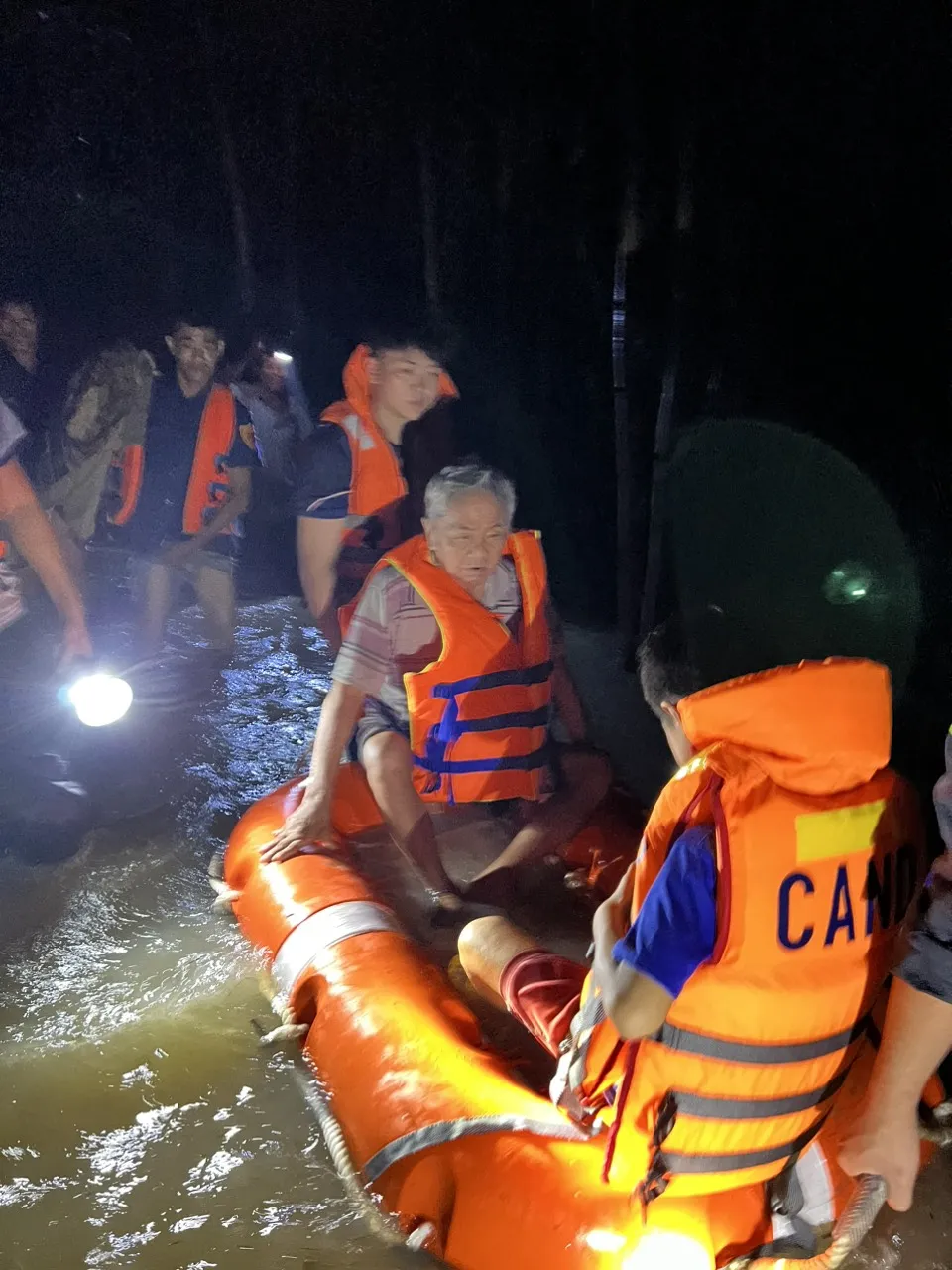 | Lực lượng chức năng cứu hộ 2 ông cháu ra khỏi vùng ngập lụt trong đêm |