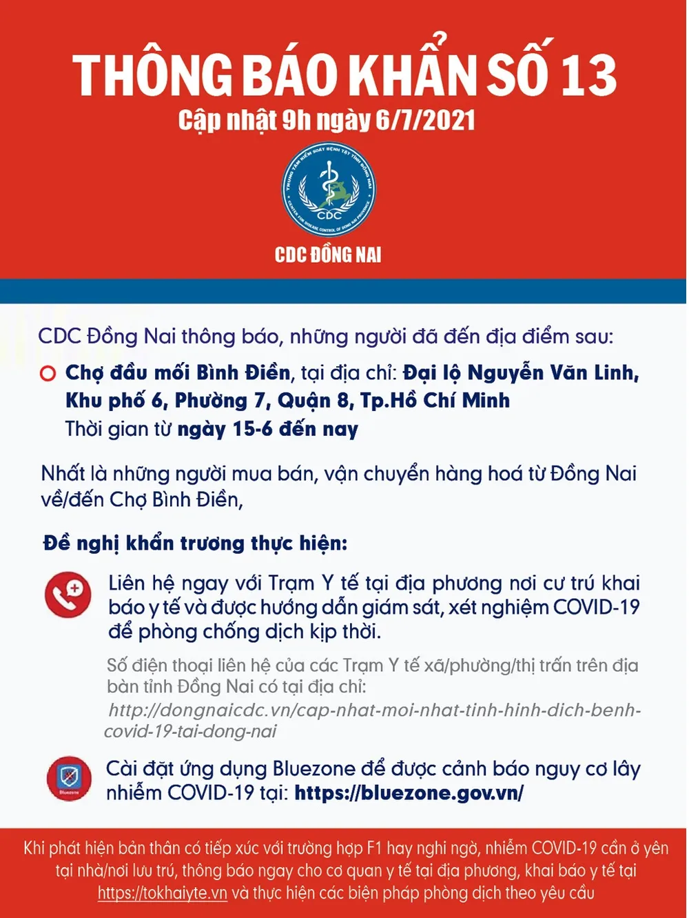CDC Đồng Nai đề nghị những người mua bán, vận chuyển hàng hoá từ Đồng Nai về/đến chợ đầu mối Bình Điền trong thời gian trên, khẩn trương liên hệ ngay với Trạm Y tế tại địa phương nơi cư trú khai báo y tế và được hướng dẫn giám sát, xét nghiệm Covid-19, cách ly y tế để phòng chống dịch kịp thời.