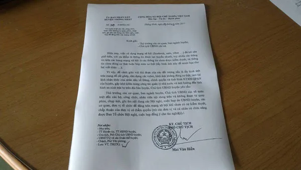 Văn bản của UBND huyện Thống Nhất cấm cán bộ chụp hình, quay phim
