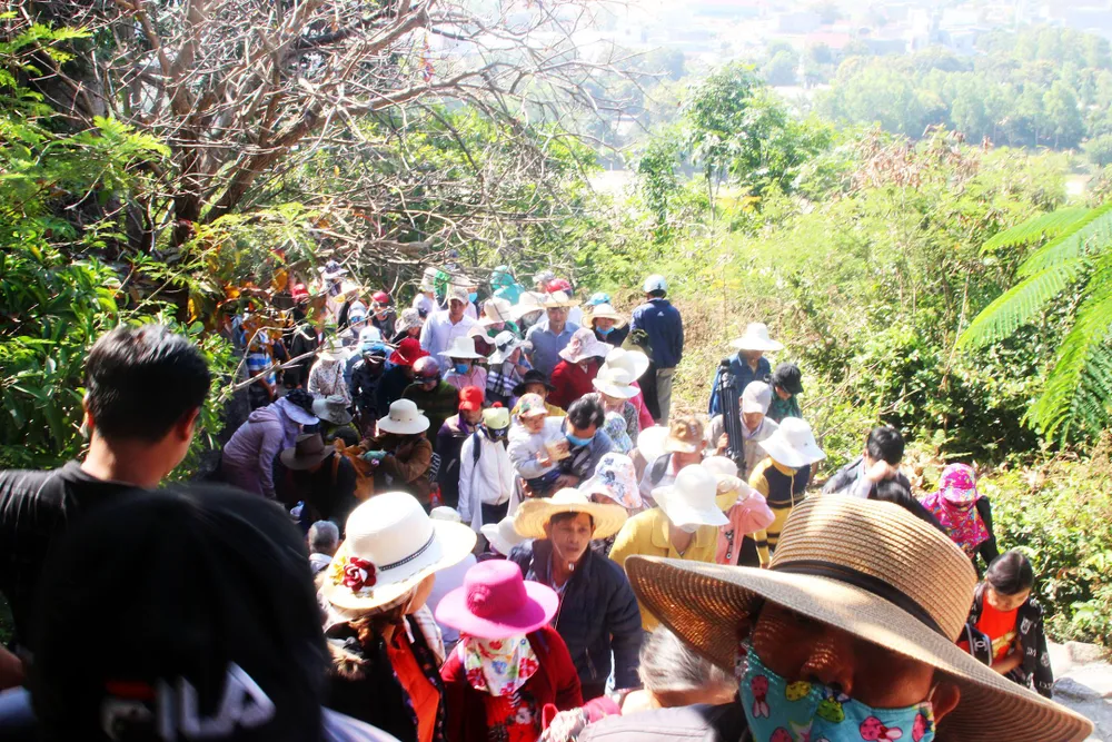 Người dân dự lễ chùa Ông Núi (tên chữ là Linh Phong thiền tự) tọa lạc ngay lưng chừng đỉnh Chóp Vung - đỉnh cao nhất của dãy núi Bà, về phía Đông Nam của xã Cát Tiến