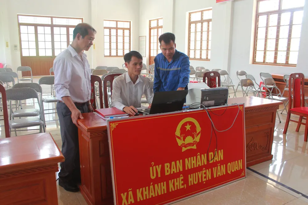 Trong 2 ngày vận hành thử nghiệm mô hình chính quyền địa phương hai cấp VNPT Lạng Sơn đã bố trí 2 nhân viên trực tiếp có mặt tại mỗi xã, phường và các nhân viên viễn thông hỗ trợ từ xa để hỗ trợ toàn diện về dịch vụ viễn thông, đường truyền và dịch vụ công trực tuyến khi vận hành thử nghiệm. Hình ảnh này ghi lại khoảnh khắc cán bộ VNPT huyện Văn Quan đang phối hợp, hướng dẫn cán bộ sử dụng và khai thác hiệu quả phần mềm dịch vụ công trực tuyến tại UBND xã Khánh Khê.