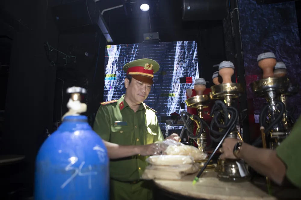 Thời điểm kiểm tra, gần 50 khách đang hòa theo tiếng nhạc cực lớn ở quán. Kiểm tra căn phòng ở tầng 1 của quán, công an phát hiện 200 vỏ bóng và bình khí N20 (nghi là bóng cười, bơm để bán cho khách) và hàng chục bình thuốc shisa. Qua làm việc, quản lý của quán không xuất trình được giấy tờ nguồn gốc xuất xứ, hoá đơn chứng từ.