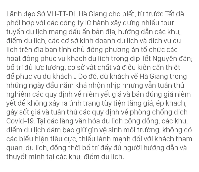 Ngập tràn hương sắc với hoa đào, hoa mai, với những cánh đồng cải trổ bông vàng ruộm... cao nguyên đá Hà Giang trong những ngày đầu năm đẹp tựa như lạc vào miền cổ tích. Chính nhờ ưu thế đó, dù đường xá xa xôi, trắc trở song nhiều du khách vẫn lựa chọn nơi này là điểm đến được yêu thích trong những ngày đầu Xuân.