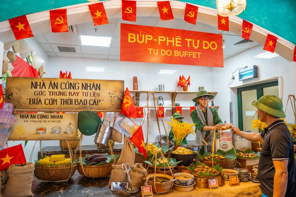 Thay cho những màn trình diễn châu Âu đặc trưng, các vũ công quốc tế hòa mình trong vũ điệu cách mạng, khiến từng giai điệu trở thành lời tri ân sống động với thế hệ cha anh. Không gian khu buffet “Tự Do” cũng gây ấn tượng mạnh, khi tái hiện hương vị ẩm thực thời bao cấp – giai đoạn khó khăn nhưng đầy tự hào của dân tộc – đan xen với các món Âu - Á hiện đại, mang đến trải nghiệm vừa mới mẻ, vừa hoài niệm.