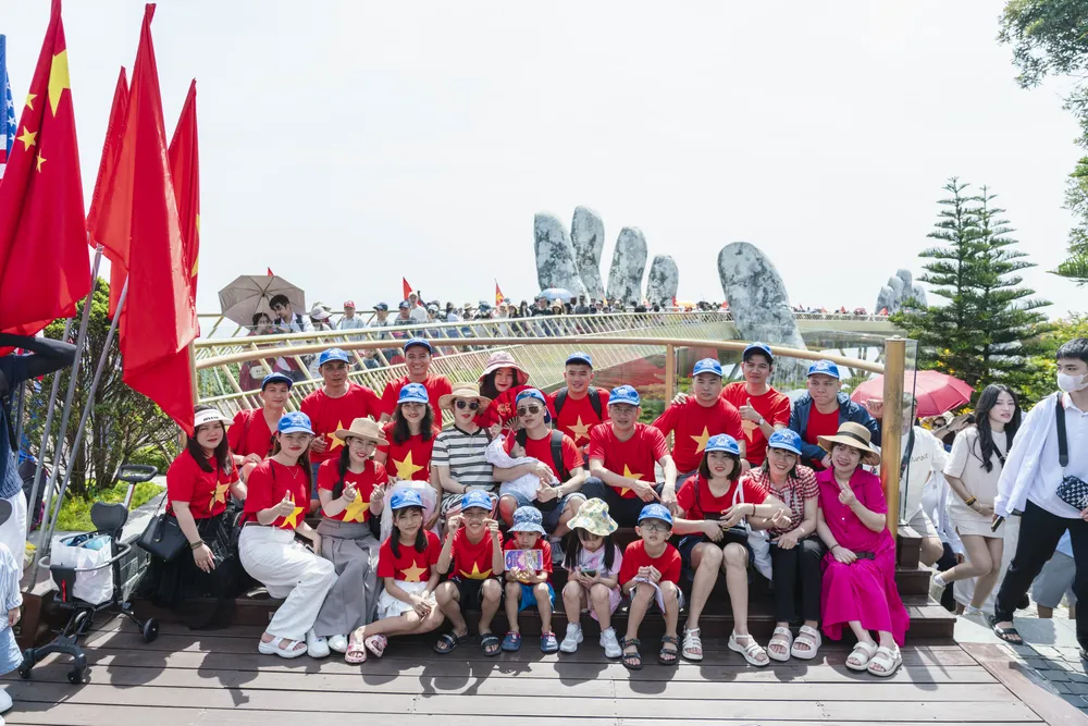 Không khí tại miền Trung còn sôi động và rực rỡ với nhiều hoạt động. Tại Sun World Bà Nà Hills (xã Hòa Phú, huyện Hòa Vang, TP Đà Nẵng), hàng ngàn du khách từ người già đến trẻ nhỏ cùng diện áo cờ đỏ sao vàng, tạo nên khung cảnh rực rỡ, gắn kết.
