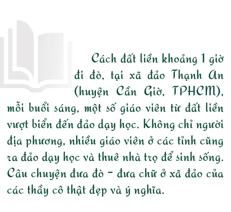 Cách đất liền khoảng 1 giờ đi đò, tại xã đảo Thạnh An (huyện Cần Giờ, TPHCM), mỗi buổi sáng, một số giáo viên từ đất liền vượt biển đến đảo dạy học. Không chỉ người địa phương, nhiều giáo viên ở các tỉnh cũng ra đảo dạy học và thuê nhà trọ để sinh sống. Câu chuyện đưa đò - đưa chữ ở xã đảo của các thầy cô thật đẹp và ý nghĩa.