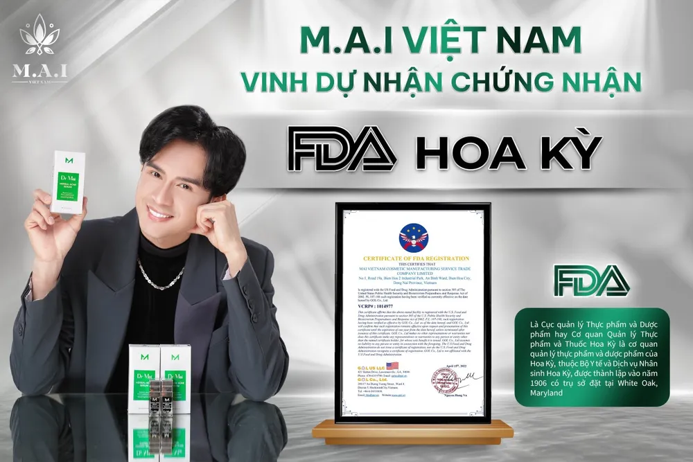 Với nguồn nguyên liệu tự nhiên và công nghệ vô trùng, chất lượng sản phẩm của Dr Mai đã đạt được chứng nhận FDA của Cục quản lý Thực phẩm và Dược phẩm Hoa Kỳ. Điều này giúp các sản phẩm của Công ty M.A.I vượt qua các rào cản về kỹ thuật, tiêu chuẩn chất lượng, xuất xứ hàng hóa khắt khe nhất để tiến vào nhiều thị trường khắc nghiệt như và đặc biệt khó tính như Canada, Nhật, Hàn Quốc, Thái, Singapore. Trong chiến lược phát triển đến năm 2027, chúng tôi đặt mục tiêu đưa M.A.I VN trở thành thương hiệu Việt mang tầm vóc Châu Á.