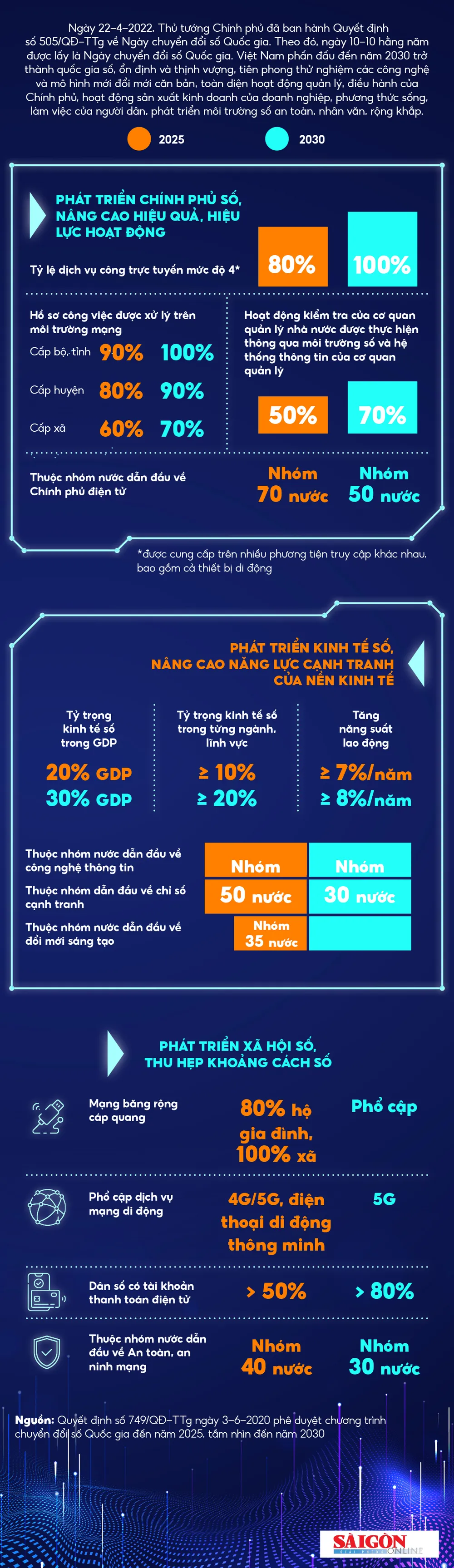 Ngày 22-4-2022, Thủ tướng Chính phủ đã ban hành Quyết định số 505/QĐ-TTg về Ngày chuyển đổi số Quốc gia. Ngày 10-10 hàng năm được lấy là Ngày Chuyển đổi số Quốc gia. Việt Nam phấn đấu đến năm 2030 trở thành quốc gia số, ổn định và thịnh vượng, tiên phong thử nghiệm các công nghệ và mô hình mới đổi mới căn bản, toàn diện hoạt động quản lý, điều hành của Chính phủ, hoạt động sản xuất kinh doanh của doanh nghiệp, phương thức sống, làm việc của người dân, phát triển môi trường số an toàn, nhân văn, rộng khắp.
