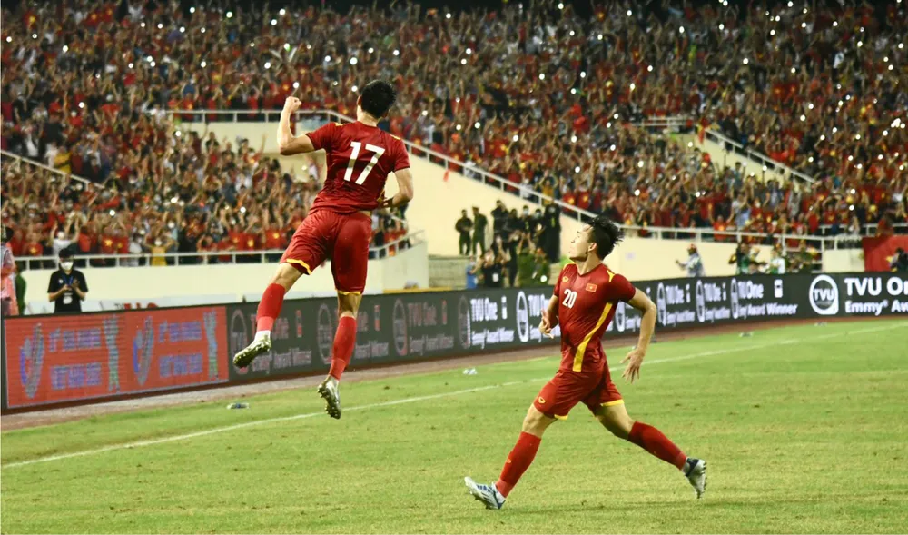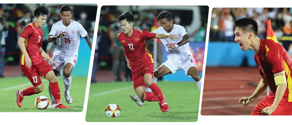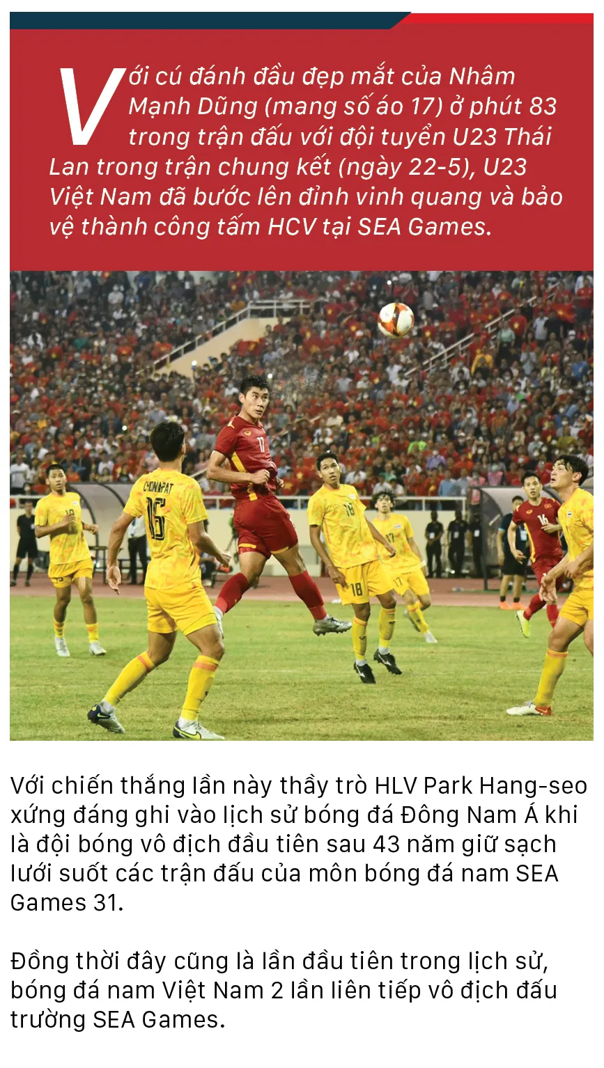 Với cú đánh đầu đẹp mắt của Nhâm Mạnh Dũng (mang số áo 17) ở phút 83 trong trận đấu với đội tuyển U23 Thái Lan trong trận chung kết (ngày 22-5), U23 Việt Nam đã bước lên đỉnh vinh quang và bảo vệ thành công tấm HCV tại SEA Games.