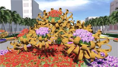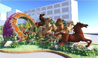 Tại vị trí tháp đồng hồ thường ngày là một quả địa cầu với điểm nhấn là nước Việt Nam được nâng bởi nhiều bàn tay cách điệu chuyển tải thông điệp “Hãy chung tay gìn giữ hành tinh xanh”. Phía đầu hướng ra đường Tôn Đức Thắng là hai tiểu cảnh với hình ảnh 5 cánh sen được nhân cách hóa thành bàn tay con người biết làm chủ thời gian sẽ nắm bắt được thành công tốt đẹp như mọi vật thuộc mùa xuân.