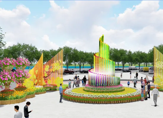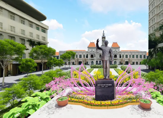 Khu vực Tượng đài Chủ tịch Hồ Chí Minh được trang trí những luống hoa dọc theo hai làn hoa hiện hữu với 36 chậu mai vàng, điểm xuyến sắc hồng hoa đào ngày Tết tạo thành con đường rực rỡ sắc xuân dẫn đến Tượng đài Bác Hồ. Phía sau tượng đài Bác, hai hàng mai vàng tạo nền cho đóa hoa sen nhẹ nhàng, ấm áp. Những cánh sen hồng ban ngày hiện lên trên nền mai vàng như một đóa hoa khổng lồ khoe sắc dưới ánh nắng ngày xuân, ban đêm những cánh sen tỏa sáng mang lại vẻ đẹp rực rỡ, lung linh cho đại cảnh “ Việt Nam đẹp nhất tên Người”.