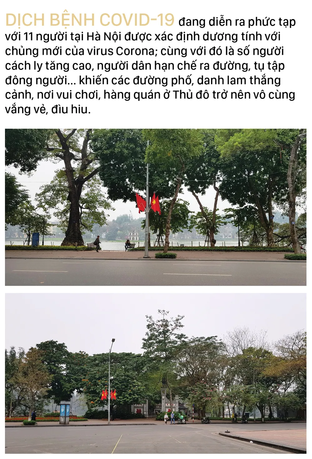 Dịch bệnh Covid-19 đang diễn ra phức tạp với 11 người tại Hà Nội được xác định dương tính với chủng mới của virus Corona; cùng với đó là số người cách ly tăng cao, người dân hạn chế ra đường, tụ tập đông người... khiến các đường phố, danh lam thắng cảnh, nơi vui chơi, hàng quán ở Thủ đô trở nên vô cùng vắng vẻ, đìu hiu.