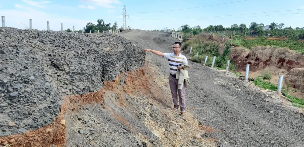 Ghi nhận thực tế tại vị trí hư hỏng, mặt đường giờ đây đã tan nát, từng đoạn gãy đứt. Có đoạn lún sâu cả mét. Đá dăm nổi lởm chởm trên bề mặt đường. Vị trí hư hỏng dài khoảng 100m nhìn như một công trường đổ nát.