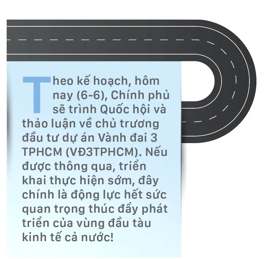 TPHCM với vai trò điều phối và chuẩn bị đầu tư dự án VĐ3TPHCM, đồng chí Phan Văn Mãi, Ủy viên Trung ương Đảng, Phó Bí thư Thường trực Thành ủy TPHCM, Chủ tịch UBND TPHCM cho biết, vừa qua, ngày 19-5, Đoàn công tác của Quốc hội do đồng chí Vũ Hồng Thanh, Chủ nhiệm Ủy ban Kinh tế của Quốc hội cùng các đồng chí lãnh đạo của TPHCM, Bình Dương, Đồng Nai và Long An đã tiến hành khảo sát thực địa dự án để chuẩn bị trình Quốc hội. Khi chứng kiến cảnh kẹt xe trầm trọng tại các cửa ngõ, nút giao dự kiến kết nối với đường VĐ3TPHCM, nhiều thành viên trong đoàn khảo sát đã nhận xét, nếu tuyến đường VĐ3TPHCM được đầu tư sớm thì tình hình đã tốt hơn!
