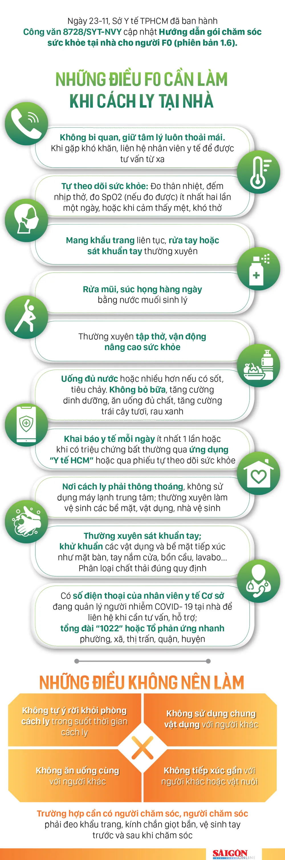 Ngày 23-11, Sở Y tế TPHCM đã ban hành Công văn 8728/SYT-NVY cập nhật Hướng dẫn gói chăm sóc sức khỏe tại nhà cho người F0 (phiên bản 1.6).