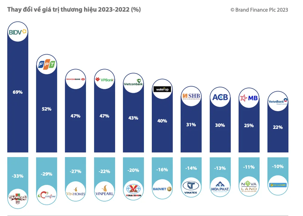 Với mức tăng trưởng vượt bậc (thêm 105%, chiếm 2% tổng giá trị), ngành Công nghệ đã và đang nổi lên như một ngành có tiềm năng tăng trưởng lớn, đặc biệt trong thời đại chuyển đổi số. Đứng đầu ngành công nghệ theo bảng xếp hạng thương hiệu giá trị nhất Việt Nam 2023 là FPT, với giá trị thương hiệu lên đến 594,5 triệu USD, tăng 52%.