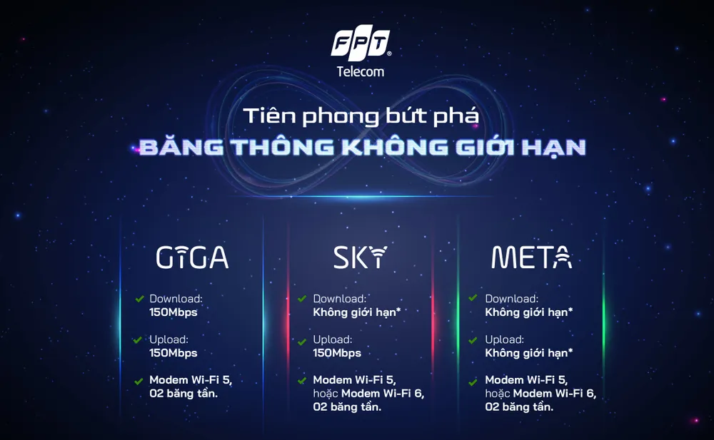 Từ ngày 1-1-2023, FPT Telecom chính thức triển khai “Mở băng thông - Không giới hạn” với ba gói cước mới cho khách hàng. Trong đó, gói cước Sky và Meta cung cấp băng thông không giới hạn với tốc độ tải thực tế tối đa được xác định theo năng lực thiết bị đầu cuối, hoặc thiết bị sử dụng truy cập Internet của khách hàng. Và đi kèm với các gói cước mới là thiết bị Modem Wi-fi hai băng tần đời mới cùng giải pháp mở rộng vùng phủ theo chuẩn Wi-fi 5 hoặc Wi-fi 6, để phát huy tối đa hiệu quả băng thông, cũng như gia tăng trải nghiệm khi sử dụng dịch vụ.