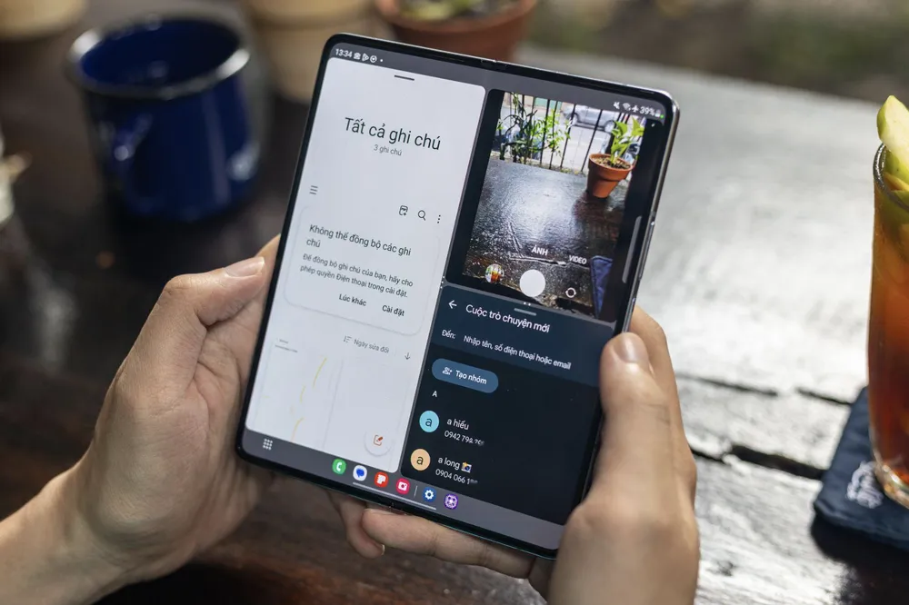 Hơn nữa, Galaxy Z Fold5 cho phép chia màn hình thành tối đa 3-4 khu vực, người dùng dễ dàng so sánh dữ liệu hay các ứng dụng khác nhau, tăng độ đa nhiệm. Chế độ Flex Mode gập điện thoại lại và đặt lên bàn giúp người dùng thoải mái hơn trong những cuộc họp khẩn từ xa vì không cần phải giữ thiết bị liên tục như trên "Táo khuyết".