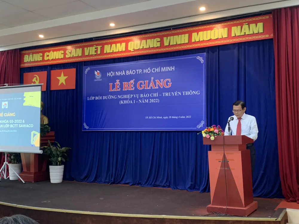 Nhà báo Nguyễn Tấn Phong, Phó Chủ tịch Thường trực Hội Nhà báo TPHCM trao giấy chứng nhận cho các học viên. Ảnh: CHÍ THẠCH