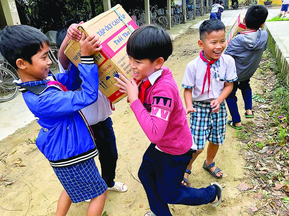 Học sinh vùng lũ vui mừng nhận những tập vở trắng. Ảnh: VĂN THẮNG