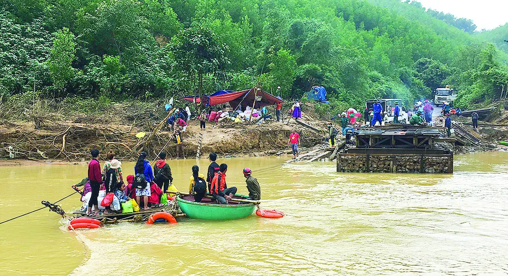 Do cầu sập, học sinh xã Vĩnh Ô (huyện Vĩnh Linh, tỉnh Quảng Trị) vượt sông Bến Hải bằng bè đến trường. Ảnh: NGUYỄN HOÀNG