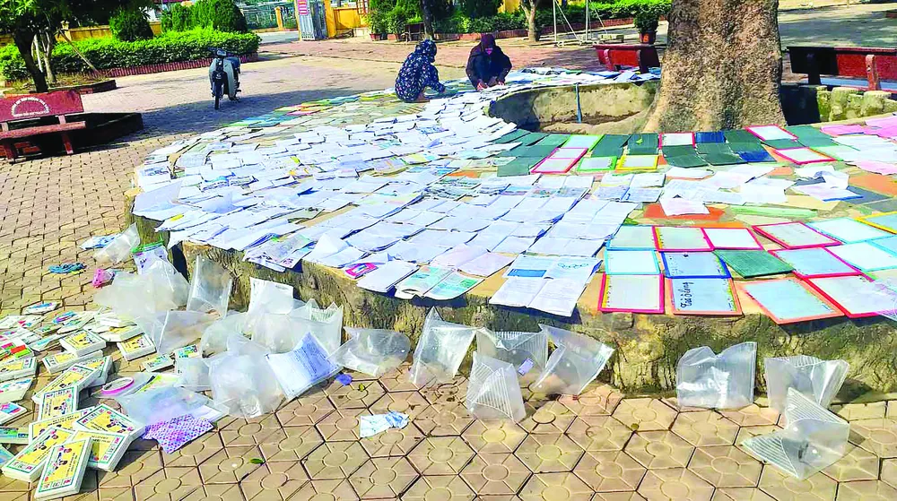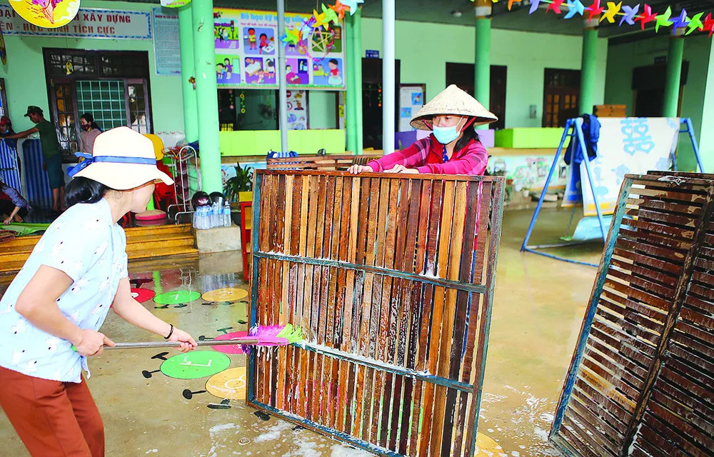 Phơi sách vở bị ướt ở Trường Tiểu học Thạch Tân (tỉnh Hà Tĩnh). Ảnh: DƯƠNG QUANG