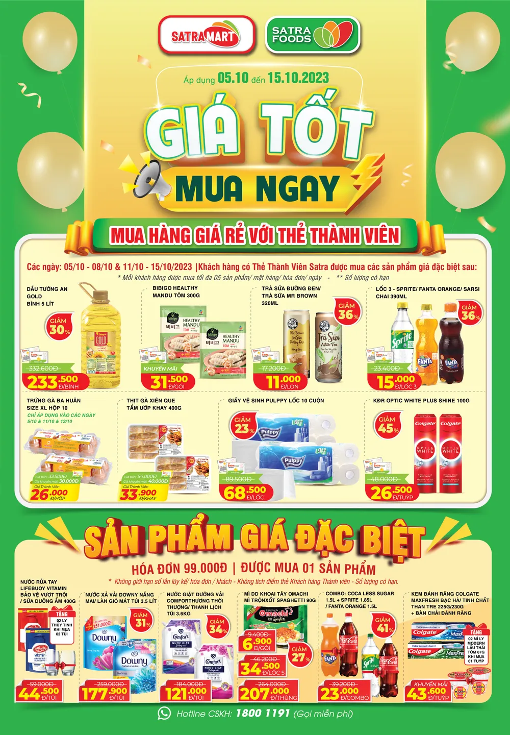 Trong các ngày, 5-10 đến 8-10 và 11-10 đến 15-10, khách hàng thành viên SATRA sẽ được mua các sản phẩm với giá ưu đãi như bánh xếp Bibigo healthy Mandu tôm còn 31.500 đồng/gói 300gr, dầu Tường An gold còn 233.500 đồng/bình 5lít, giấy vệ sinh Pulppy còn 68.500 đồng/lốc 10 cuộn, kem đánh răng Optic white plus shine còn 26.500 đồng/tuýp 100gr... cùng nhiều sản phẩm khác.
