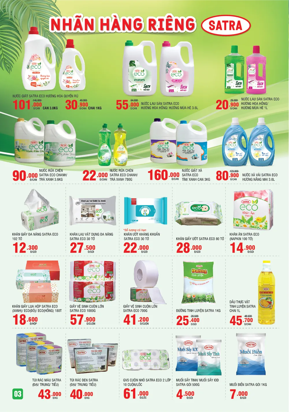 Nhiều sản phẩm là hàng nhãn riêng SATRA cũng giảm giá trong chương trình này như nước giặt Satra Eco hương hoa quyến rũ còn 101.000 đồng/can 3,8kg – 30.900 đồng/chai 1kg, nước lau sàn Satra Eco hương hoa hồng/hương mùa hè còn 55.000 đồng/can 3,6lít, nước xả vải Satra Eco hương nắng mai còn 80.900 đồng/can 3,6lít, nước rửa chén Satra Eco chanh/trà xanh còn 90.000 đồng/can 3,6kg, giấy vệ sinh cuộn lớn Satra Eco còn 57.900 đồng/cuộn 1kg, khăn giấy lụa hộp Satra Eco còn 18.600 đồng/hộp 180 tờ, đường tinh luyện Satra còn 25.400 đồng/gói 1kg, muối sấy tinh/iod Satra còn 4.500 đồng/gói 500gr, muối biển Satra còn 7.000 đồng/gói 1kg.. cùng nhiều sản phẩm khác.