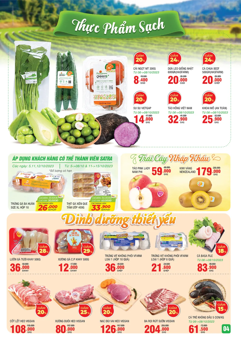 Hàng loạt các sản phẩm dinh dưỡng thiết yếu, thực phẩm sạch tươi ngon mỗi ngày cũng giảm giá trong dịp này như xương đuôi heo Vissan còn 80.000 đồng/kg, ba rọi rút sườn Vissan còn 204.000 đồng/kg, nạc đùi vai heo Vissan còn 126.000 đồng/kg, táo Pink Lady Nam Phi còn 59.000 đồng/kg, kiwi vàng New Zealand còn 179.000 đồng/ký…