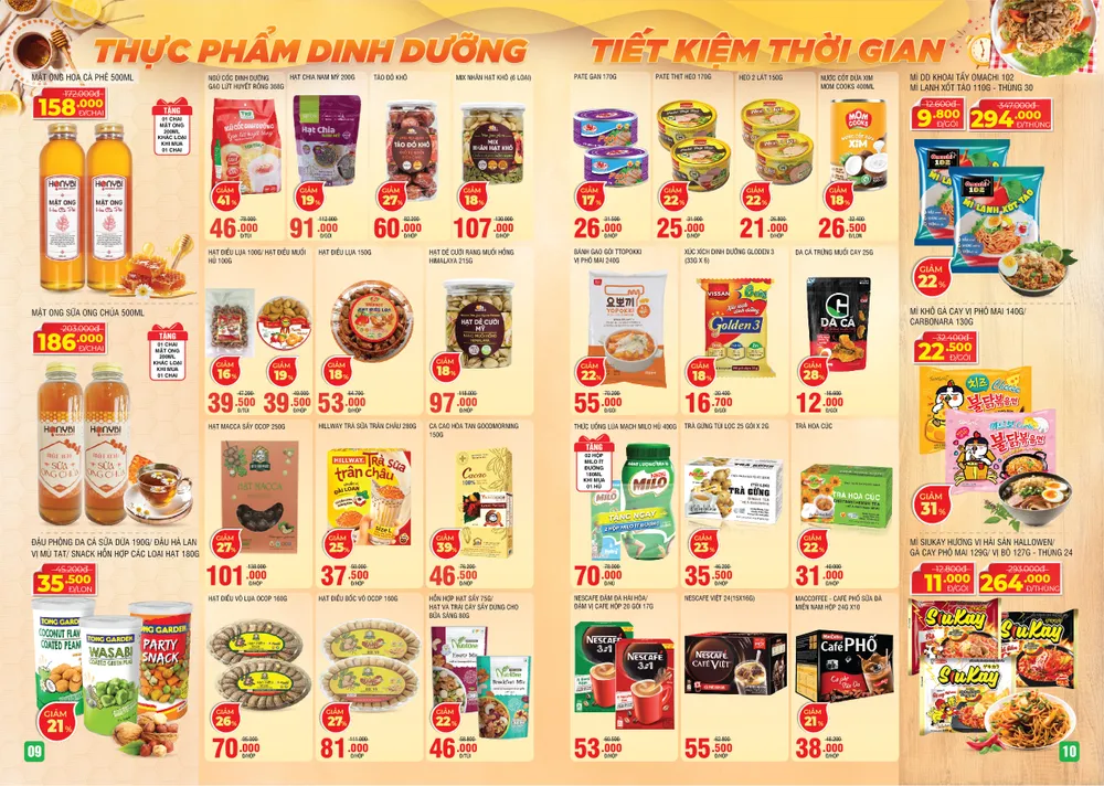 Hàng loạt sản phẩm giảm giá - không thể bỏ lỡ - như chả giò Cầu Tre Real thịt còn 46.400 đồng/gói 400gr, nước giặt Omo Matic Comfort tinh dầu thơm/cửa trên/thư thái cửa trước/bền đẹp cửa trước còn 146.000 đồng/túi 2,8kg/2,9kg cùng quà tặng là 1 nước giặt Omo túi 421gr, dầu gội Pantene ngăn rụng tóc còn 145.000 đồng/chai 900ml, kem que socola nguyên chất/TH dừa tự nhiên của TH true ice cream còn 9.800 đồng/que, gạo tấm sông hồng còn 117.500 đồng/túi 5kg, gạo ST25 còn 151.000 đồng/túi 5kg, ngũ cốc dinh dưỡng gạo lứt huyết rồng còn 46.000 đồng/túi 368gr, cacao hòa tan Goodmorning còn 46.500 đồng/hộp 150gr...