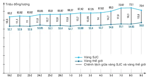 Tâm lý chuộng vàng của người dân đã song hành cùng giá vàng SJC nhảy múa thời gian qua, cũng như bất hợp lý khi so sánh với giá vàng thế giới. Từ đầu năm đến nay, giá vàng thế giới tăng từ 1.830 USD/ounce (tương đương khoảng 50,2 triệu đồng/lượng) lên 1.985 USD/ounce (55,2 triệu đồng/lượng), tăng khoảng 5 triệu đồng/lượng, thì giá vàng SJC trong nước tăng từ 61 triệu đồng/lượng lên 73 triệu đồng/lượng (trong ngày 8-3), tăng đến 12 triệu đồng/lượng.
