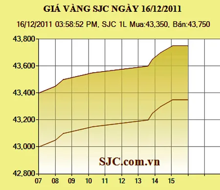 (SGGPO).- Chốt giá chiều nay, 16-12, giá vàng tăng 350.000 đồng/lượng so với giá cuối chiều qua ở mức 43,75 triệu đồng/lượng, trong khi đó giá vàng giao ngay trên sàn London giao dịch ở mức 1.592 USD/ounce.