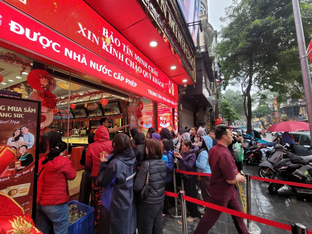 Ghi nhận trong sáng 25-2, dọc phố Trần Nhân Tông (Hà Nội) đông nghịt, thậm chí nhiều lúc còn bị ùn tắc, khi người dân tập trung xếp hàng trước các cửa hàng vàng như: Bảo Tín Minh Châu, Phú Quý, Bảo Tín Mạnh Hải...để mua vàng.