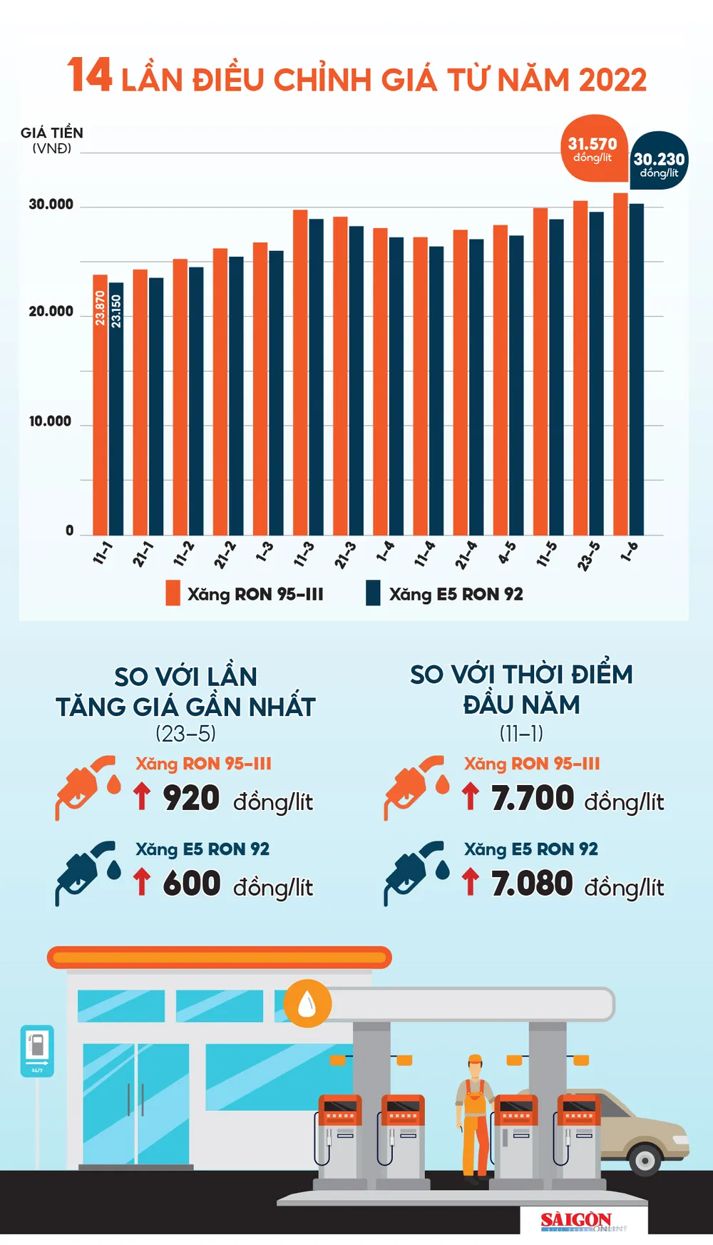Tại kỳ điều chỉnh ngày 1-6-2022, giá xăng RON 95-III đã tăng lên mức 31.570 đồng mỗi lít; xăng E5 RON 92 tăng lên mức 30.230 đồng mỗi lít. Tính từ ngày 11-1 đến 1-6, giá xăng đã có 14 lần điều chỉnh giá, trong đó có 11 lần tăng và 3 lần giảm.