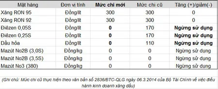 Theo văn bản số 3458/BTC-QLG ngày 19-3-2014 của Bộ Tài chính về việc điều hành kinh doanh -xăng dầu, mức chi sử dụng Quỹ Bình ổn giá (BOG) áp dụng từ 12 giờ 19-3-2014 cụ thể như sau: