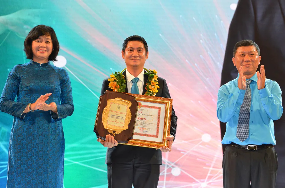 Đồng chí Lê Thanh Liêm, Phó Chủ tịch Thường trực UBND TPHCM trao Giải thường Tôn Đức Thắng cho anh Nguyễn Ngọc Chiến. Ảnh: VIỆT DŨNG